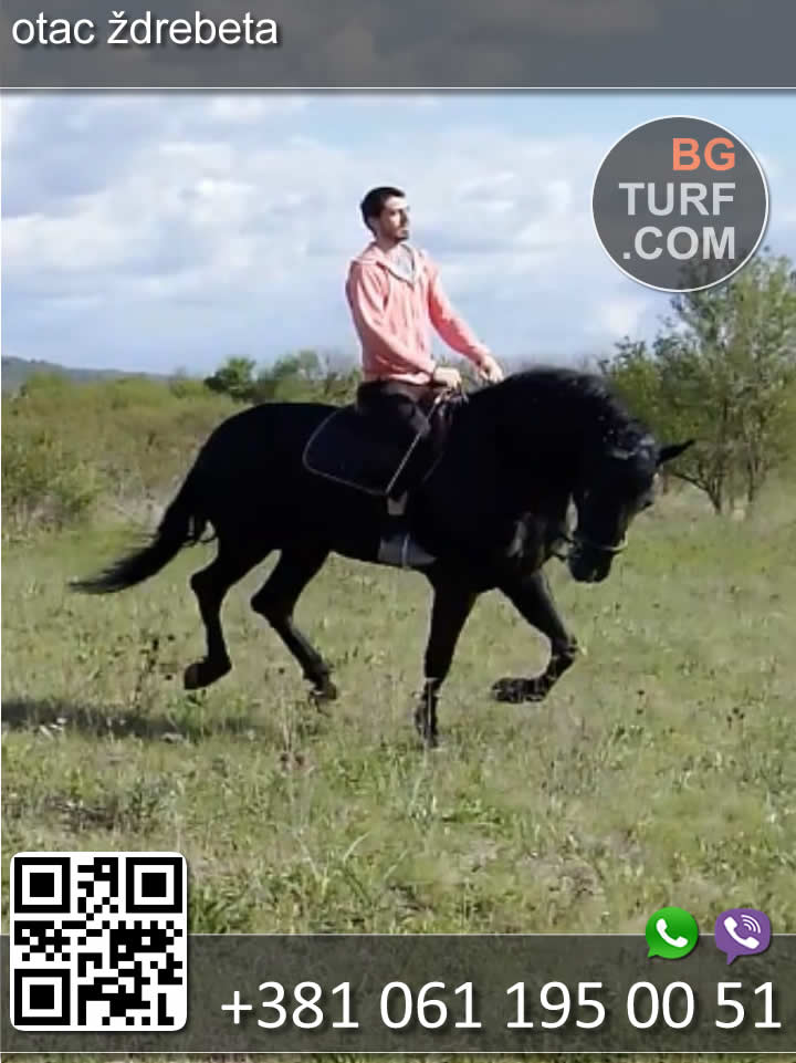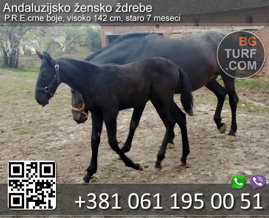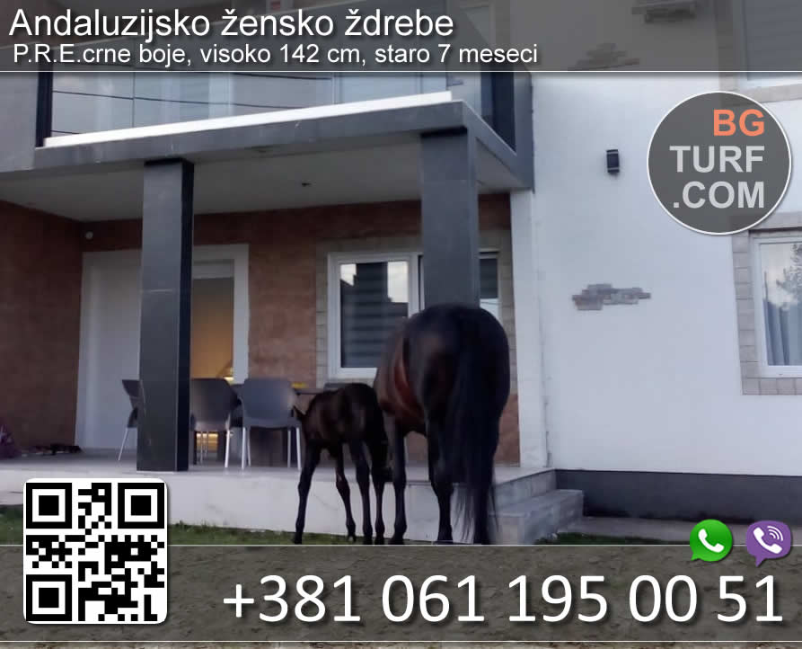 Andaluzijsko žensko ždrebe, P.R.E.crne boje, visoko 142 cm, staro 7 meseci. Otac visina grebena 177cm, majka visina grebena 174. Oba roditelja uvezena iz Španije, samoionskog porekla. Ždrebe, kao i oba roditelja nalaze se u Carevcu kod Pozarevca, Braničevski region..