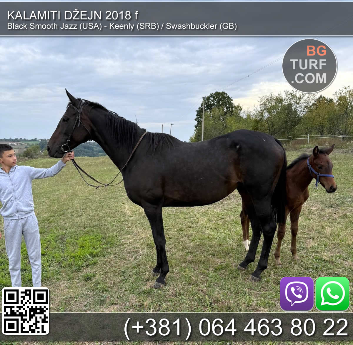Kobila i ždrebe oboje čisti englezi. Kobila je pogodna za terensko jahanje, već se jaše 3 godine na terenskom. Za početnike odlična. Grlo se nalazi u Valjevu.
